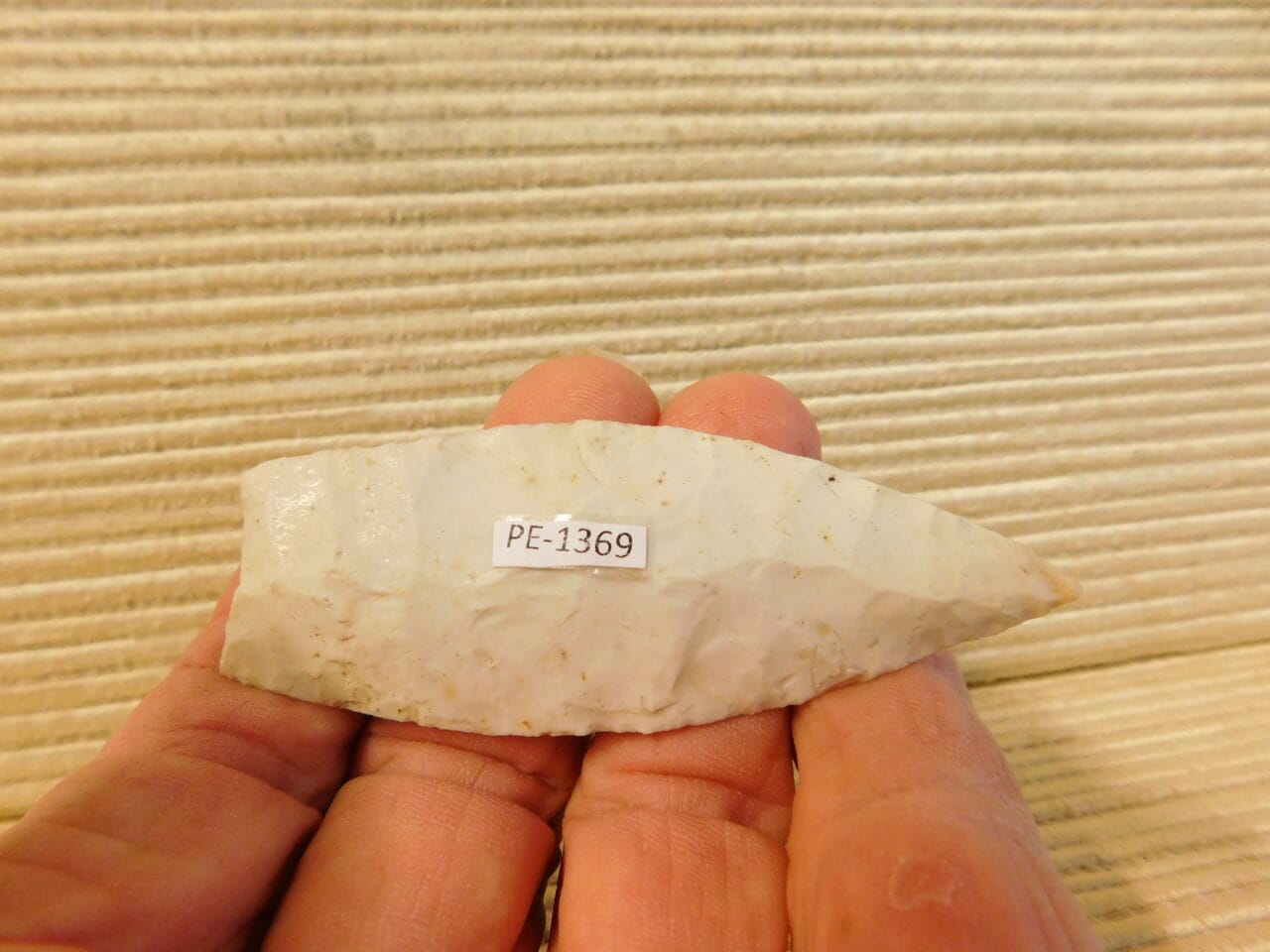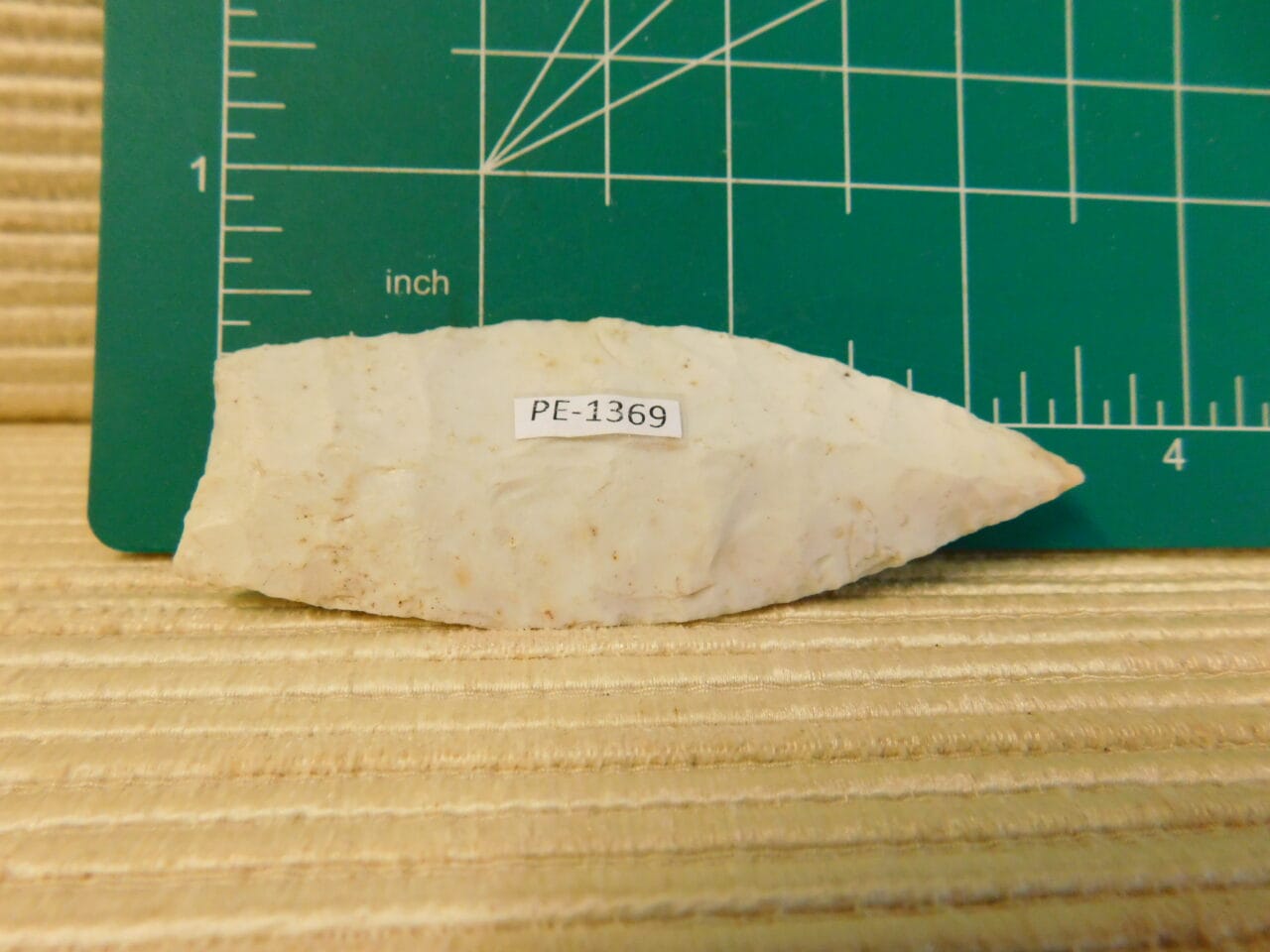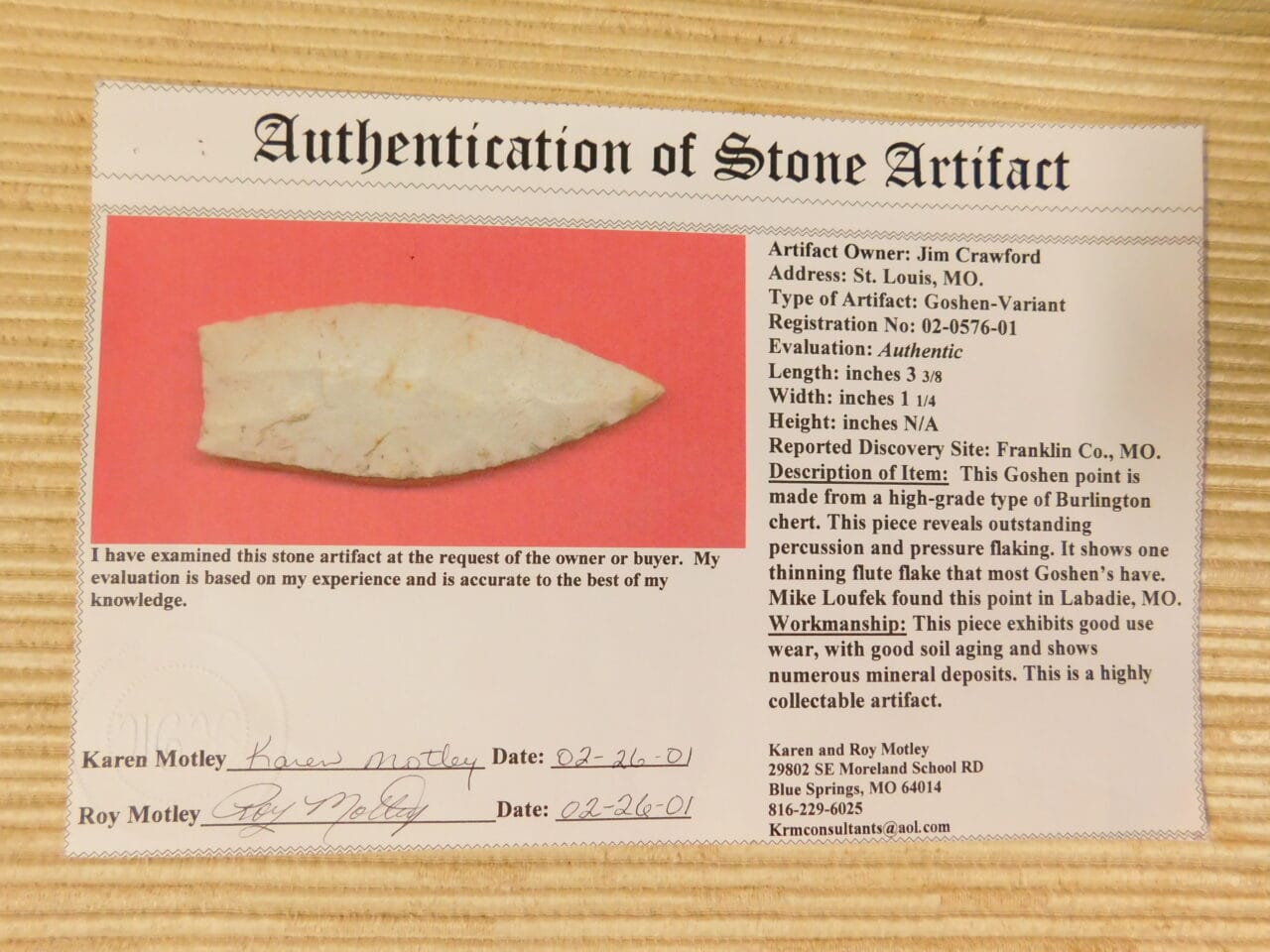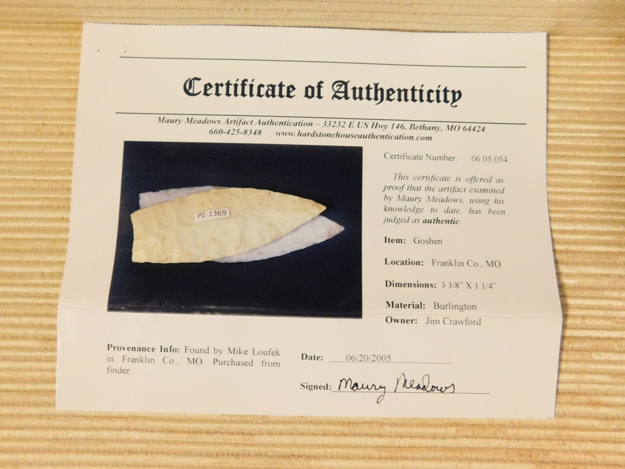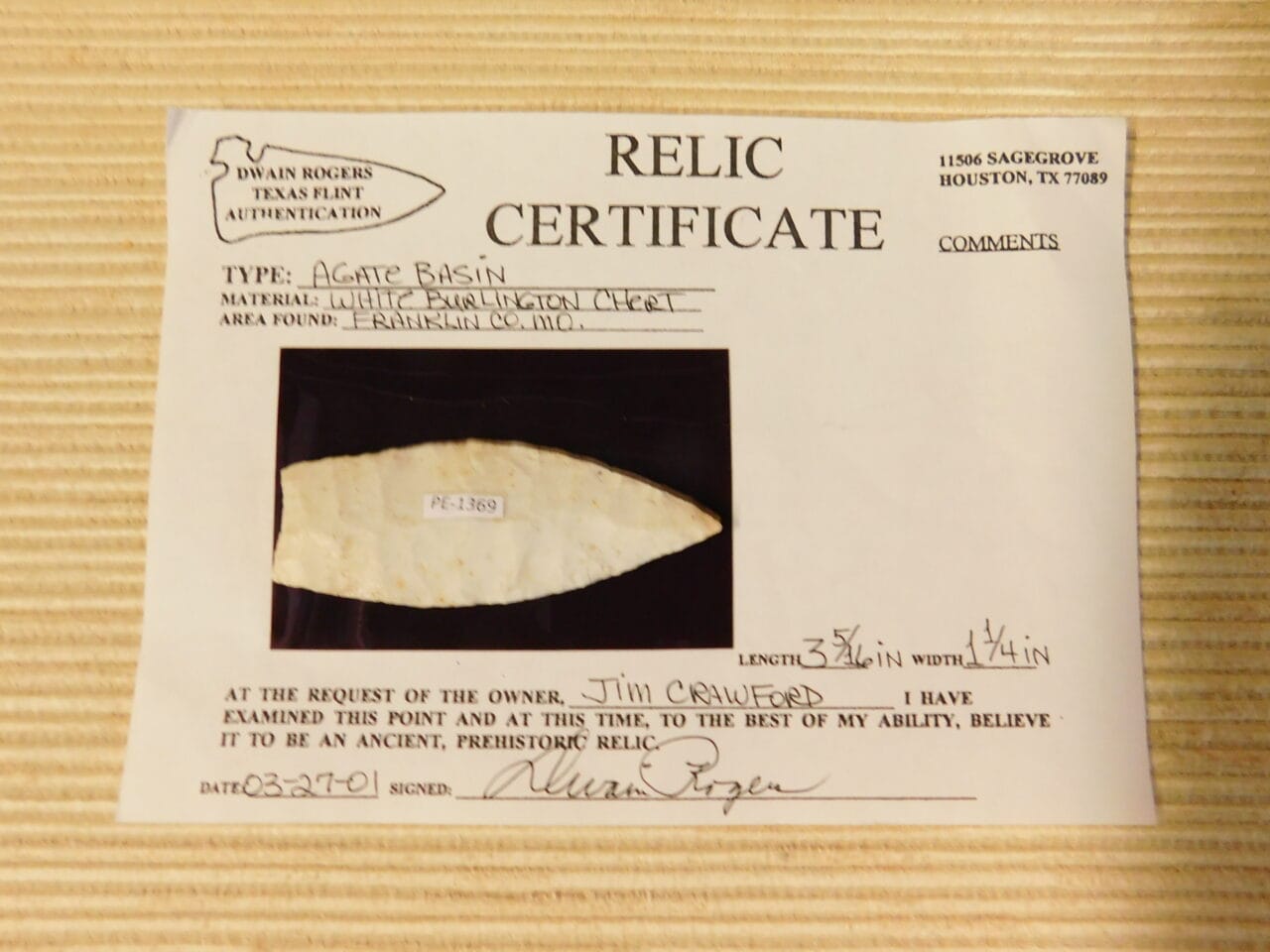 A very nice example of a Agate Basin 3 5/16 inch point Very Well Made Near perfect 3 COA’s 10,200 – 8500 BP This was Jim Ccawford coll. White Burlington Chert. Roy Motley; Maury Meadows; Dwain Rodgers Authentication; Franklin Co. Moissouri.