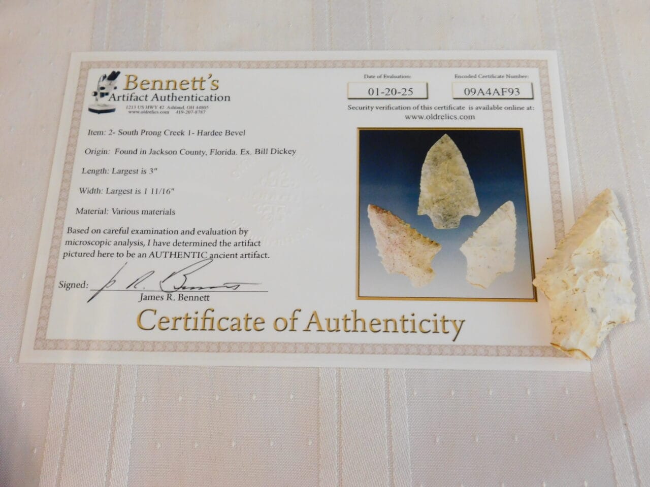 Authentic Hardee Bevel point, certified by Bennett’s Artifact Authentication to be an authentic ancient artifact. Signed by James R. Bennett. COA included