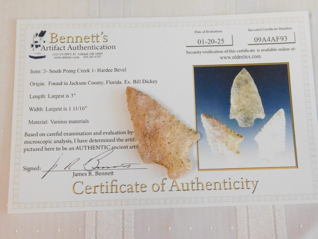 Authentic Hardee Bevel point, certified by Bennett’s Artifact Authentication to be an authentic ancient artifact. Signed by James R. Bennett. COA included