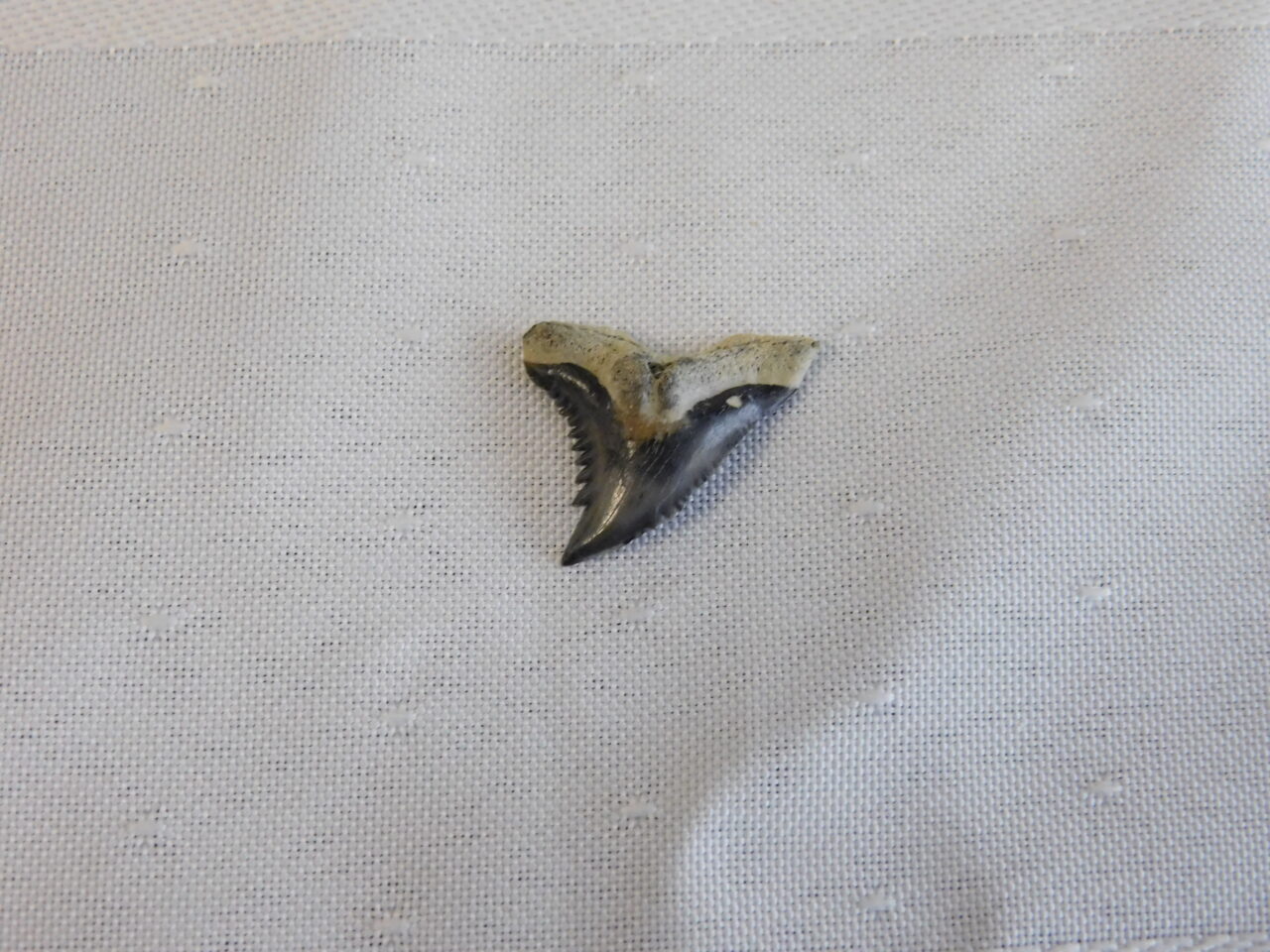 Hemipristisw Shark Tooth fossil; Bone Valley FL; boxed in hinged acrylic display case